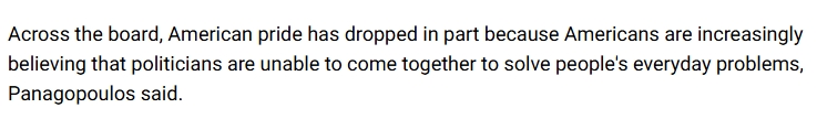 學界對年輕羣體的自豪感下滑並不意外。《新聞週刊》(Newsweek)的文章寫道,美國東北大學政治學教授科斯塔斯·帕納戈普洛斯(Costas Panagopoulos)認為,Z世代的理想主義與美國政治現實的落差是主因——年輕選民在審視政治時,更多感受到沮喪與失望。總體來看,美國人的自豪感有所下降,部分原因在於美國人越來越認為政客們無法團結一致解決民眾的日常問題。