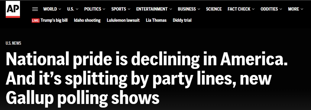 這種趨勢的根源可追溯至2001年。自蓋洛普首次開展相關調查以來,美國國家自豪感數據即持續走低。儘管“9·11”事件後,國民共識曾短暫推高自豪感,但隨後因政治分歧與社會變遷,這種共識逐漸瓦解。最新數據顯示,美國無黨派人士的國家自豪感已降至53%,為歷史最低值。