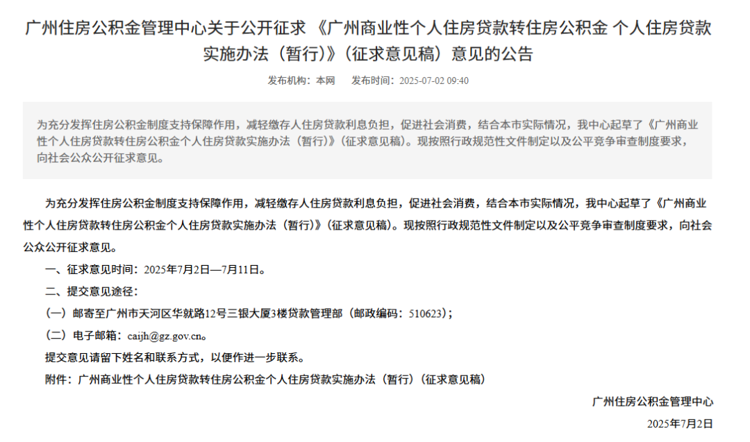 7月2日,廣州住房公積金管理中心(以下簡稱“公積金中心”)向社會公眾公開徵求《廣州商業性個人住房貸款轉住房公積金個人住房貸款實施辦法(暫行)》(徵求意見稿,以下稱“徵求意見稿”)的意見,廣州擬明確,當住房公積金個人住房貸款率(以下簡稱“個貸率”)低於75%時啓動商轉公貸款。
