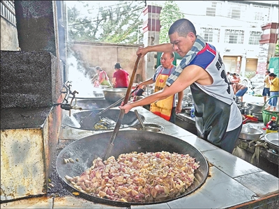 6月26日,村民在榕江縣忠誠鎮一處後勤伙食保障點炒菜。王炳真攝(新華社發)