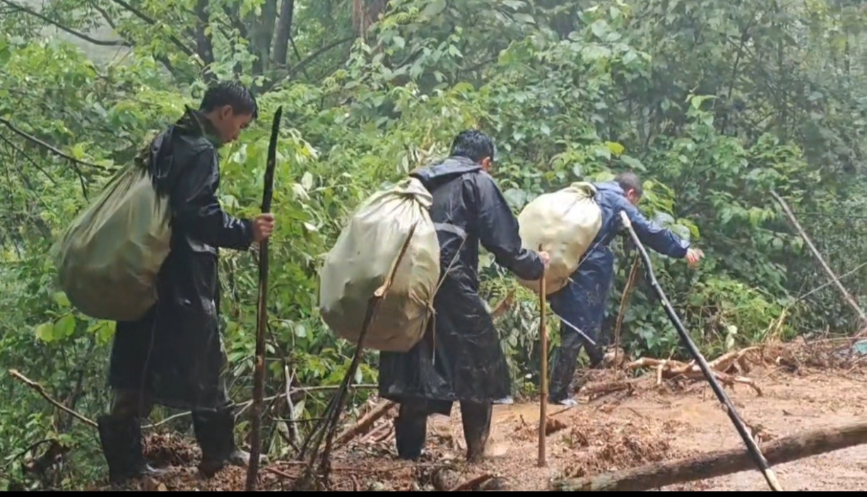 瓢潑大雨讓肩頭的物資越發沉重,但想着等待支援的村民,4人互相鼓勁,咬牙爬過了一處又一處塌方點。15時許,終於抵達目的地。