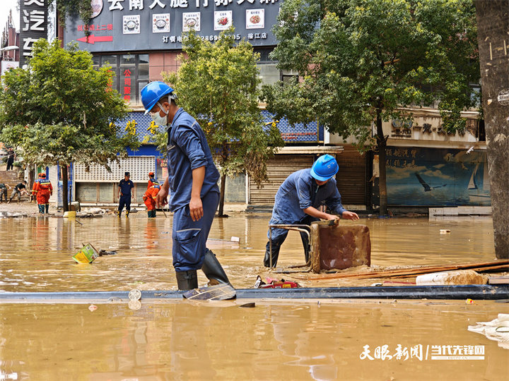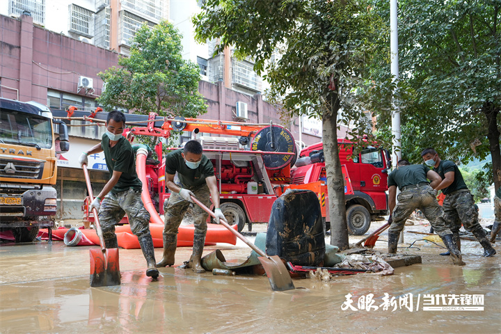 7月1日,天氣炎熱,在縣城將軍路的古州牌坊附近,齊踝深的淤泥泛着青灰色,烈日下蒸騰着酸腐的水汽。30餘名武警戰士揮舞着鐵鍬,汗珠順着脖頸滾進衣領,在後背洇出大片汗漬。