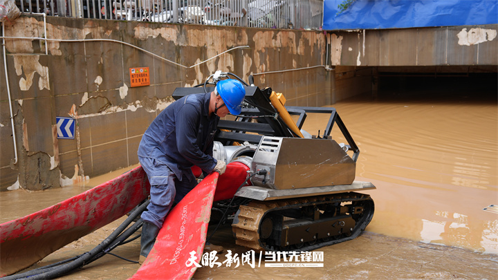 南方電網公司工作人員正在給排澇機器人接上排水管,準備為地下停車場排澇。龍定錦 攝