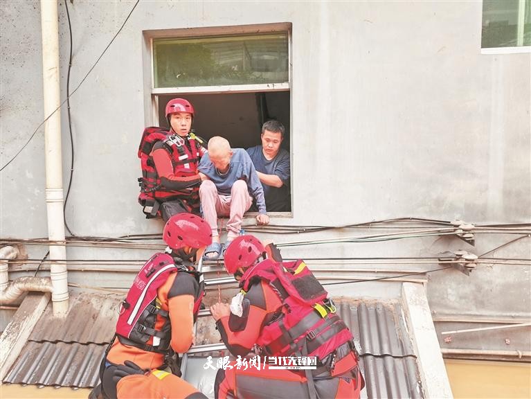 6月24日,消防隊員在黔東南州受災區救助受災羣眾。 (黔東南州消防救援支隊供圖)