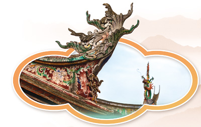 在閩南、嶺南地區,因沿海漁鹽之利,舟船形象作為百姓的生活寄託而被塑於屋脊,由此產生了眾多形制誇張的飛檐屋面。閩南建築的燕尾脊飛檐展現出獨特的地域特色,形如燕尾分叉,寓意家族興旺。福建泉州關岳廟不僅檐角為起翹連續的曲線,正脊也做成大弧度曲線,以特有的剪黏工藝,鑲嵌人物、花卉主題的彩瓷圖案,裝飾祥禽瑞獸,充滿市井生活氣息。