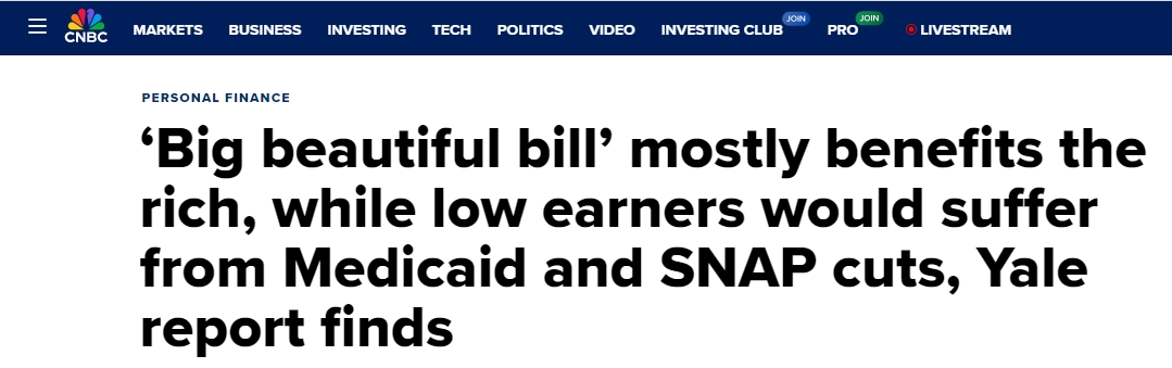 美國消費者新聞與商業頻道(CNBC)網站報道稱,根據耶魯大學預算實驗室發佈的分析報告,參議院版本的“大而美”法案將在經濟上給收入最低的美國人造成傷害,但同時又提高了較為富裕家庭的收入。