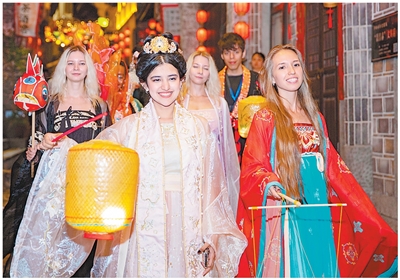 外國遊客身着漢服在江西廬山西寧街體驗民俗文化。