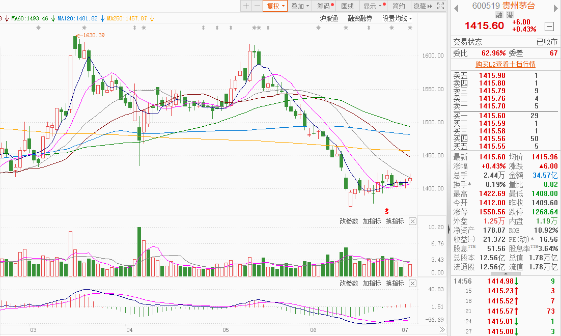 【環球網消費綜合報道】近期,飛天茅台市場價跌破2000元大關,成為白酒行業最引人關注的話題之一。此現象正引發市場對貴州茅台(600519)業績的擔憂。貴州茅台股價今年以來已下跌6.24%,至1400元/股附近,跑輸大盤。
