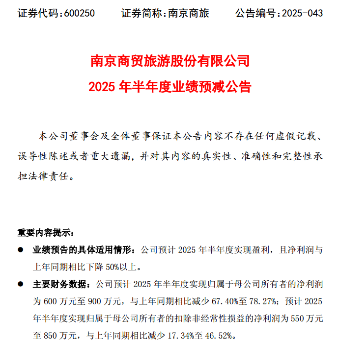 【環球網消費綜合報道】7月3日,南京商貿旅遊股份有限公司(簡稱“南京商旅”)披露的2025年半年度業績預減公告顯示,公司預計2025年上半年淨利潤僅為600萬元至900萬元,同比大幅減少67.40%至78.27%,縮水幅度近八成。