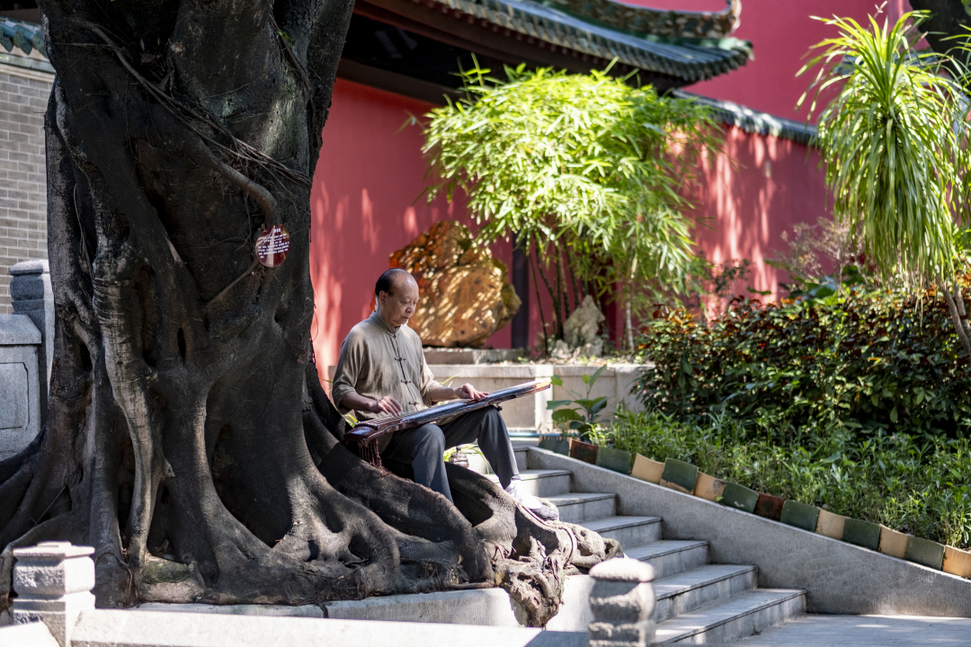 為了體驗古琴技藝,日前,小麥來到廣州五羊仙觀,只見一位老先生坐在紅牆前的古榕下,把古琴平放在雙腿上,寫意地彈奏起來。在小麥印象中,琴者多坐於琴桌前撫琴,這才是高雅姿態。這位嶺南古琴藝術家區君虹,卻追求一份“野趣”。對此,他笑着説,“坐在樹木間、石頭上撫琴,與環境融為一體,這是我們嚮往的真性情。”