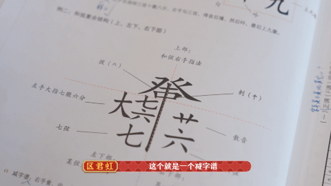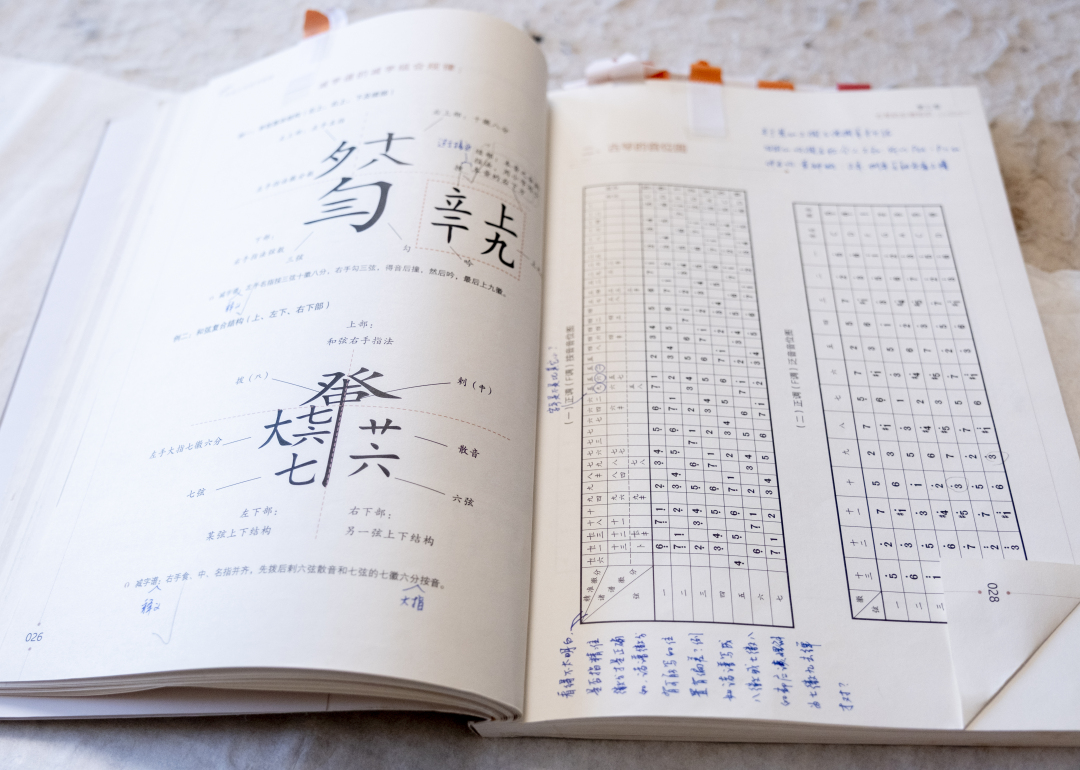 區師傅隨手指向一個“減字”來了場“小考”,小麥試着解讀:“左上方部首代表左手指法,即無名指按弦;右上方的‘九’為左手無名指對準第九徽位;中間部首對應右手指法——勾,下方的‘四’即彈奏第四弦。”藴意豐富的減字譜沿用千百年,讓像小麥這樣的“初學者”也能解讀出音位、演奏方法。