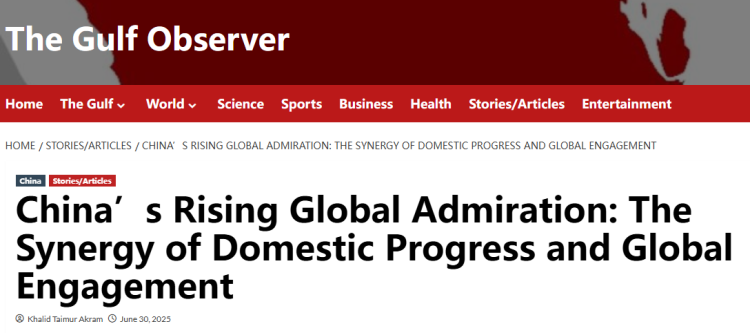 國際在線專稿:外媒“海灣觀察家”(The Gulf Observer)網站6月30日刊發評論文章《中國日益受到全球讚賞:國內進步和全球參與的協同共振》指出,近年來中國在全球範圍內的聲望顯著提升,這一成就得益於其國內經濟社會繁榮發展和積極參與全球事務兩者之間形成的協同效應。文章稱,隨着世界各國、各地區聯繫日漸緊密而動盪衝突不斷,越來越多國家將中國視為全球增長的核心引擎,以及文化活力、政策穩定性與戰略遠見的典範。從古老文明的迴響到現代產業的創新,中國的崛起不僅重塑自身,也正在推動全球敍事和發展方向朝着更加包容、均衡與合作的體系演進。