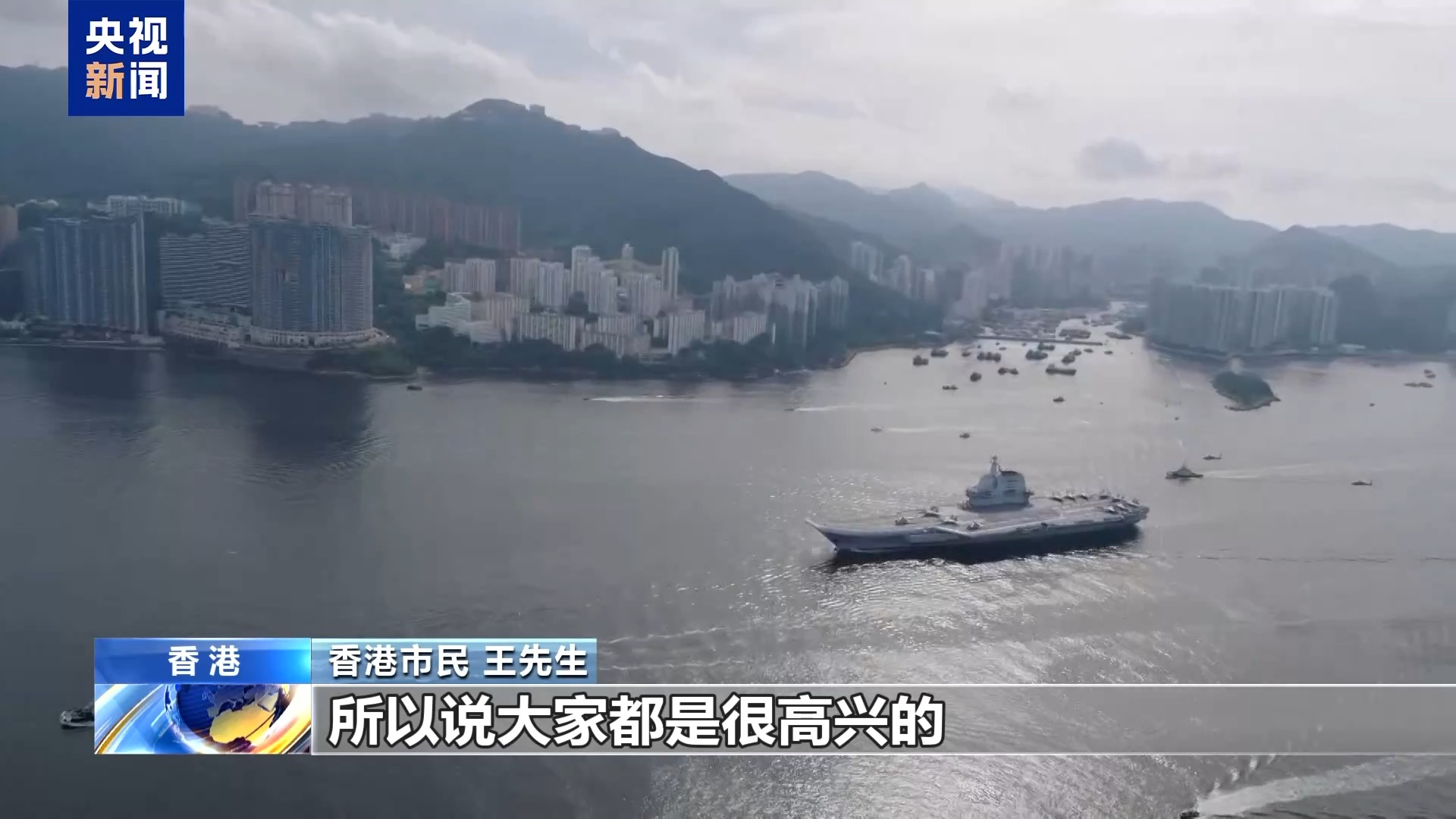*香港市民 王先生:*因為8年前我也是在這個地方親眼看着遼寧艦從這個地方穿過,心情很激動,後來我還有幸登上了遼寧艦。今天,看到這個情況,大家那麼多人,比上次人多很多,所以説大家都是很高興的。