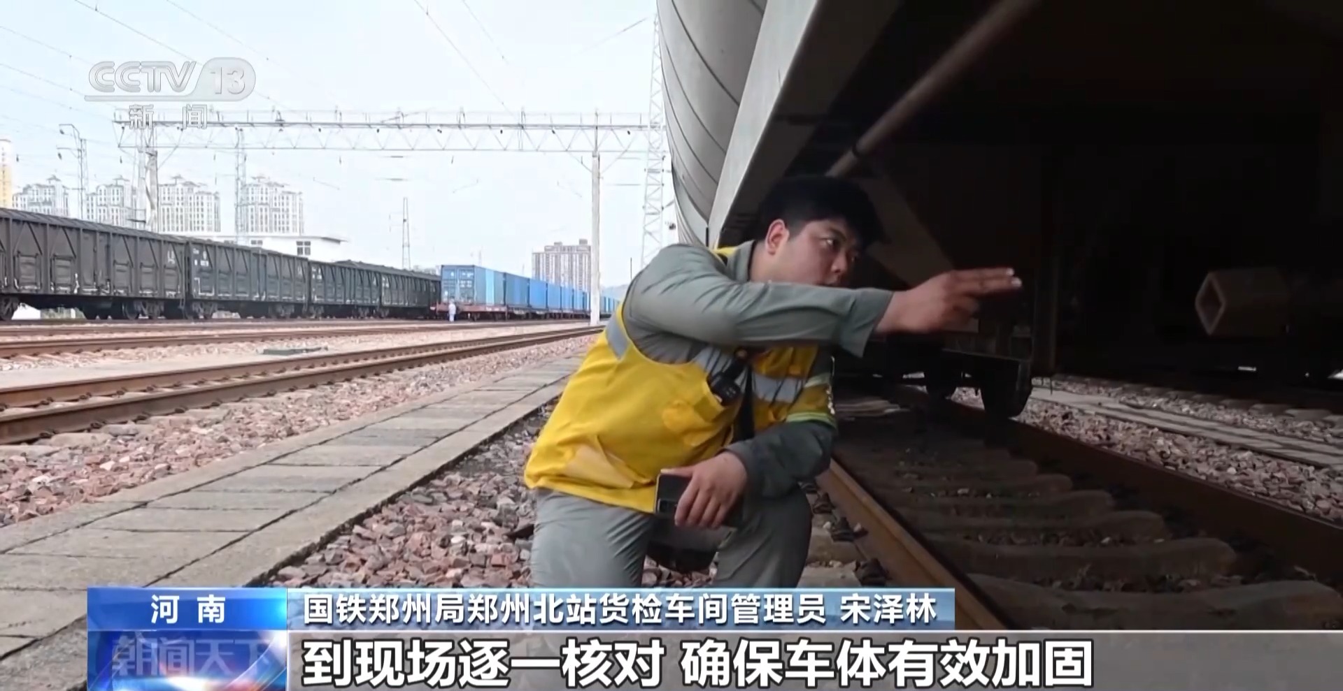 國鐵鄭州局鄭州北站貨檢車間管理員 宋澤林:對列車車頂等部位進行全面檢查,防止頂棚出現破損,到現場逐一核對,確保車體有效加固。