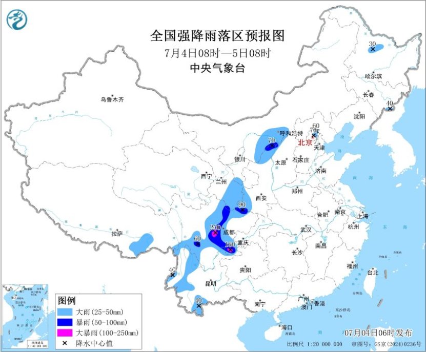 預計,7月4日08時至5日08時,內蒙古河套地區、甘肅東部、寧夏南部、陝西北部和西南部、山西北部、四川盆地西部和南部、雲南西部、西藏東部等地部分地區有大到暴雨,其中,四川盆地西部和南部等地局地有大暴雨(100~200毫米)。上述部分地區伴有短時強降水(最大小時降雨量20~50毫米,局地可超過70毫米),局地有雷暴大風等強對流天氣(見圖1)。中央氣象台7月4日06時繼續發佈暴雨藍色預警。