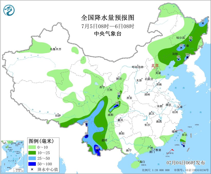 *7月5日08時至6日08時,*內蒙古東南部、東北地區中東部和西部、西藏東南部、西南地區北部和南部等地部分地區有中到大雨,其中,四川盆地西北部、雲南西南部等地部分地區有暴雨(50~90毫米)(見圖4)。