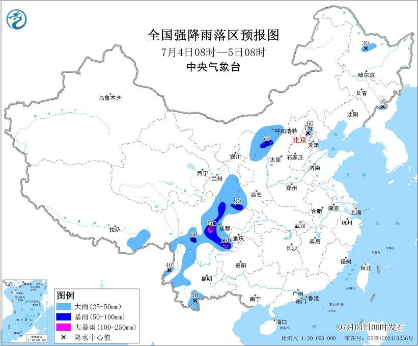 預計,7月4日8時至5日8時,內蒙古河套地區、甘肅東部、寧夏南部、陝西北部和西南部、山西北部、四川盆地西部和南部、雲南西部、西藏東部等地部分地區有大到暴雨,其中,四川盆地西部和南部等地局地有大暴雨(100~200毫米)。上述部分地區伴有短時強降水(最大小時降雨量20~50毫米,局地可超過70毫米),局地有雷暴大風等強對流天氣。