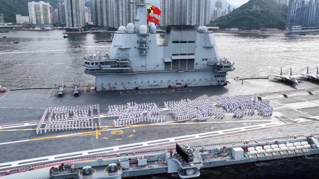 3日上午8時許,山東艦和3艘屬艦組成縱隊隊形,在香港特區政府船隊、駐香港部隊艦艇、直升機伴航伴飛下,駛入維多利亞港。山東艦飛行甲板上,艦載戰鬥機、直升機列陣,700餘名海軍官兵身着白色軍裝,列隊排出“國安家好”4個大字,香港特區政府消防輪以高規格的水門禮為編隊“接風洗塵”,表示熱烈歡迎和崇高敬意。