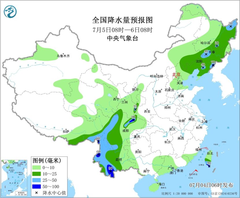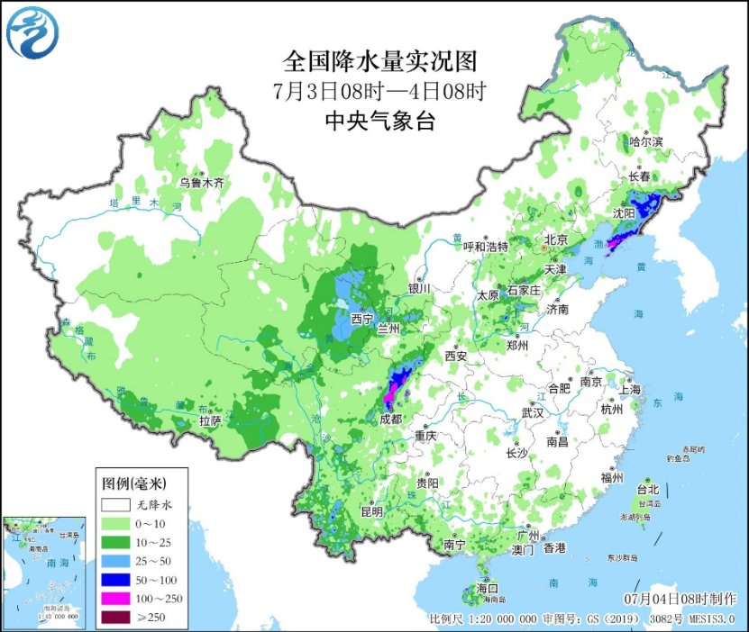 昨日,我國依然保持着四川盆地至華北、東北多降水,黃淮及以南地區高温範圍廣的狀態。其中雲南中西部、四川盆地西部、青海東北部、甘肅中部和東南部、陝西西南部、山西東南部、河北西部、遼寧東部和南部、吉林東南部等地出現大到暴雨,四川盆地西部、遼東半島大暴雨,四川綿陽、德陽、成都局地特大暴雨(250~354毫米);黃淮至華南北部出現大範圍高温天氣,日最高氣温達到37℃以上的區域涉及河南、山東、安徽、江蘇、浙江、江西等地。