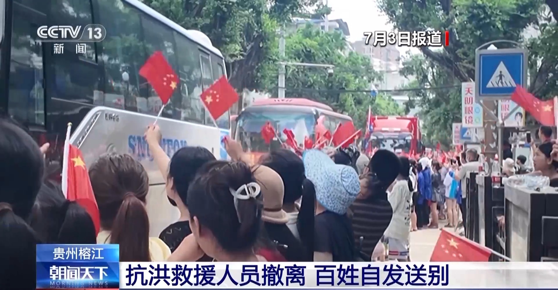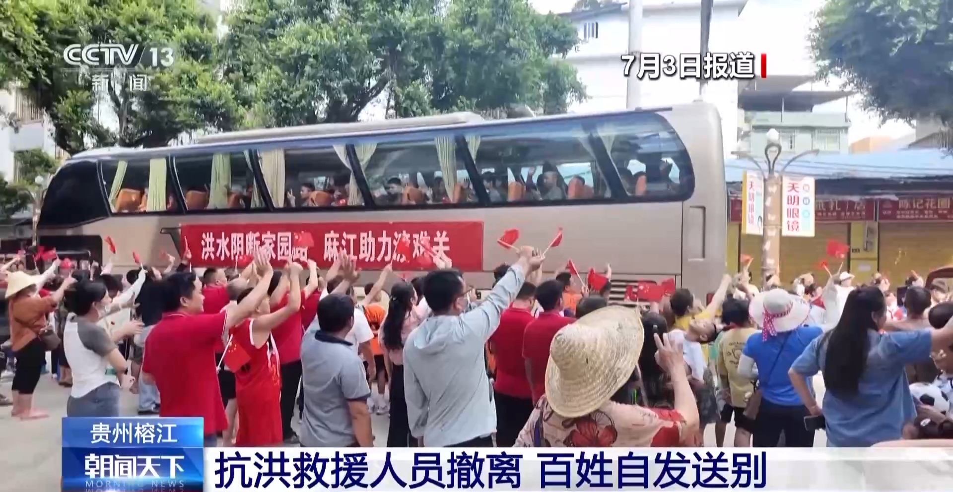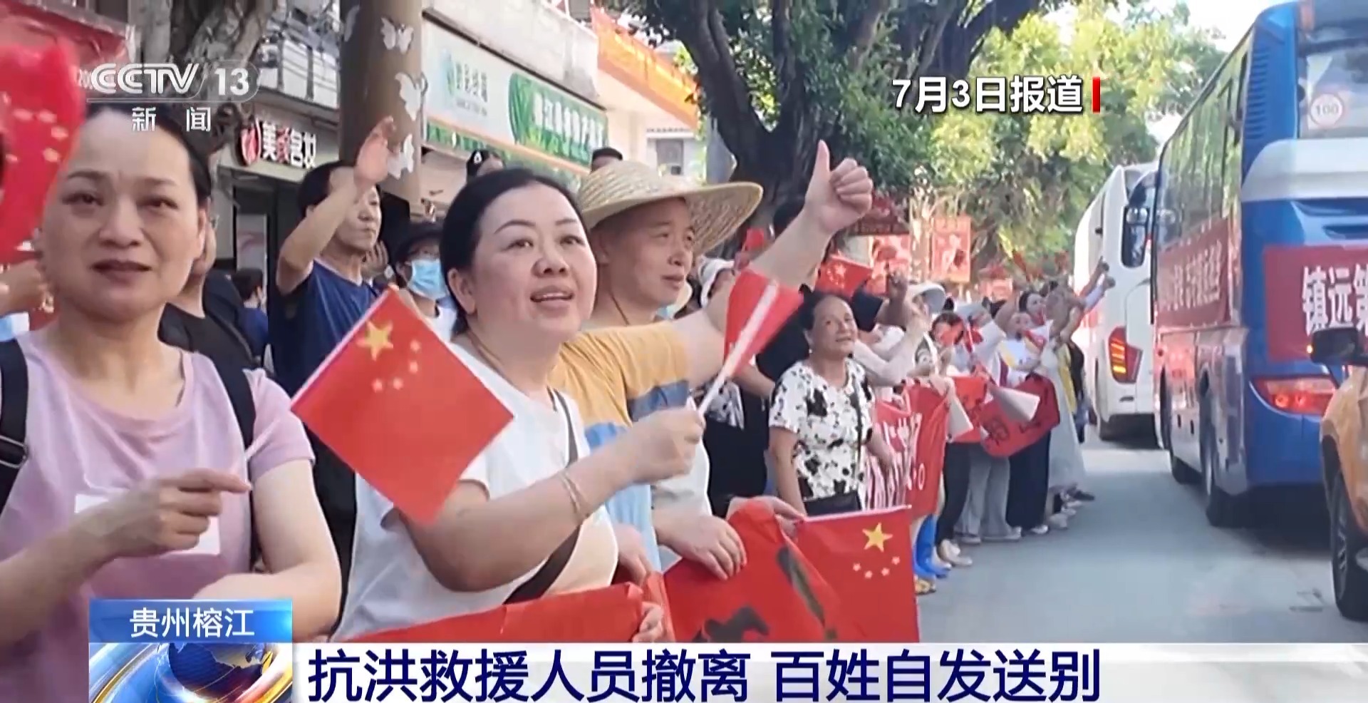 *總枱記者 田尹男:*我現在所在的位置是貴州省黔東南州榕江縣的濱江一號大道,前幾天洪水比較猛烈的時候,這條路被我身後的都柳江漫過來的江水全部淹沒,一層的商鋪都被淹沒了。經過幾天的搶險救援,現在整條道路已經恢復了正常通行。在我身後有前來榕江支援的黔東南州15個縣市的黨員羣眾,他們今天下午將乘坐大巴分批次返回家鄉,回到自己的工作崗位上。