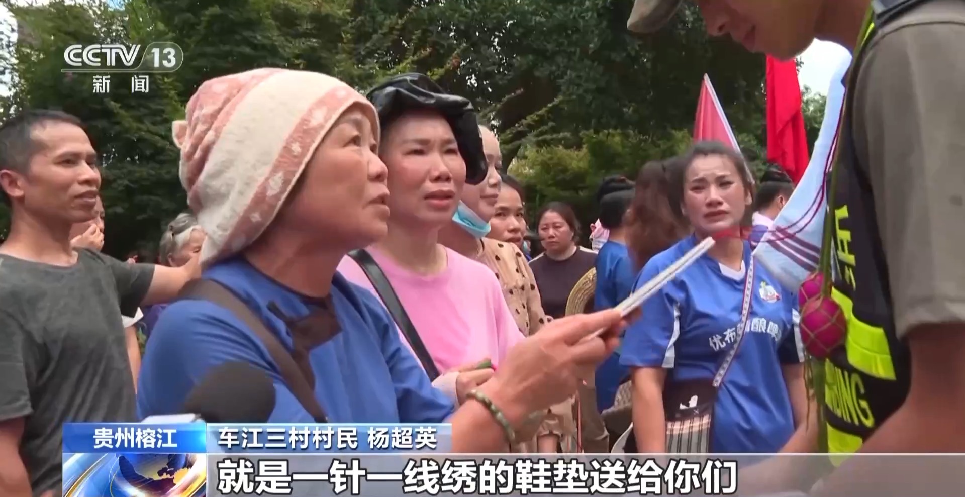 *總枱記者 田尹男:*我現在是在貴州省榕江縣的榕江三中,來自車江二村、車江三村的民眾要給為負責他們片區的來自黃平的民兵送行。道路兩邊站了很多當地的老百姓,他們自發帶着紅雞蛋、五彩繩、鞋墊、毛巾等禮物給大家送行。