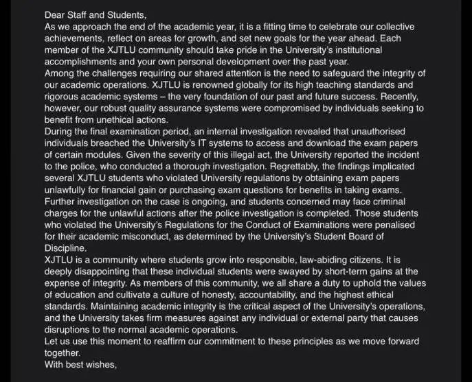 7月3日,記者致電西交利物浦大學,教務辦公室一名工作人員回應稱,內部確實收到了關於此事的郵件,三名學生因非法獲取試卷等問題被開除的情況屬實。