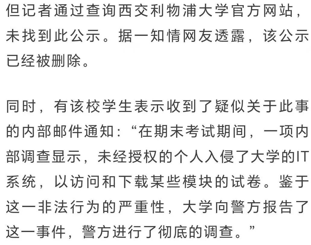 近日,有多名網友在社交媒體平台發佈消息稱,西交利物浦大學在其官網發佈了“關於給予沈某等三名學生開除學籍處分的公示”,稱三名學生因非法侵入學校信息系統獲取保密試卷、向他人出售試卷謀取不當利益等原因,學校擬給予其開除學籍處分,但該公示隨後被刪除。同時,有學生表示收到了疑似關於此公示的郵件通知。