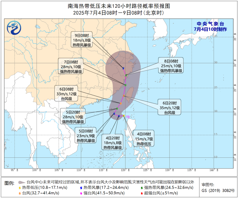 另據中央氣象台消息,該低壓將於24小時內加強為今年第4號颱風,5日午後將轉向偏北方向移動,強度繼續加強,最強可達颱風級(12~13級,33~38米/秒),並向我國台灣島西南部到福建北部一帶沿海靠近。沿海地區的朋友們要關注這個熱帶低壓未來的動向。