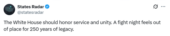 還有網友表示,“白宮應該向服務和團結致敬。格鬥之夜與250年的傳統格格不入。”↓