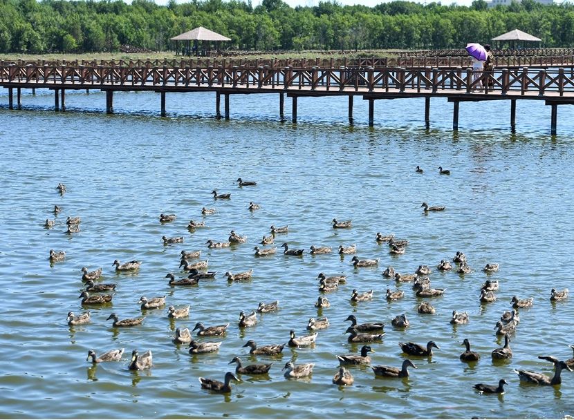 遊客在吉林省松原市查干湖野鴨島遊覽 張楠 攝