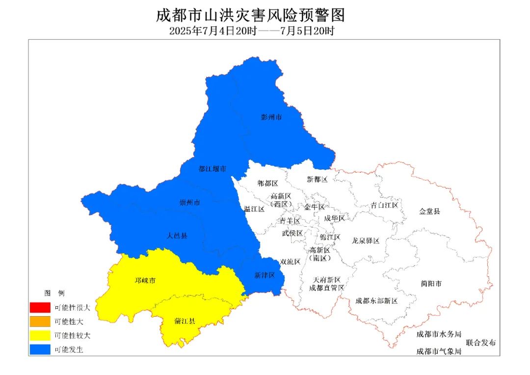 成都市氣象台2025年7月4日16時繼續發佈暴雨黃色預警,預計4日傍晚到5日白天我市有陣雨或雷雨,雨量中到大雨,中西部部分地方暴雨(50~80毫米),邛崍、蒲江和新津的局部地方有大暴雨(最大可達150~180毫米),最大小時雨量60~80毫米。經聯合會商,7月4日20時至5日20時,邛崍市、蒲江縣發生山洪災害可能性較大(黃色);彭州市、都江堰市、崇州市、大邑縣、新津區可能發生山洪災害(藍色)。