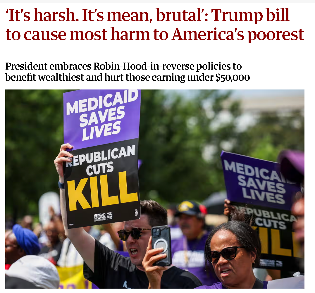 “這是殘酷的,這是惡毒的,這是野蠻的”——英國《衞報》的美國版在報道 “大而美”法案時,就在標題裏直白地表達着這種不滿的情緒。
