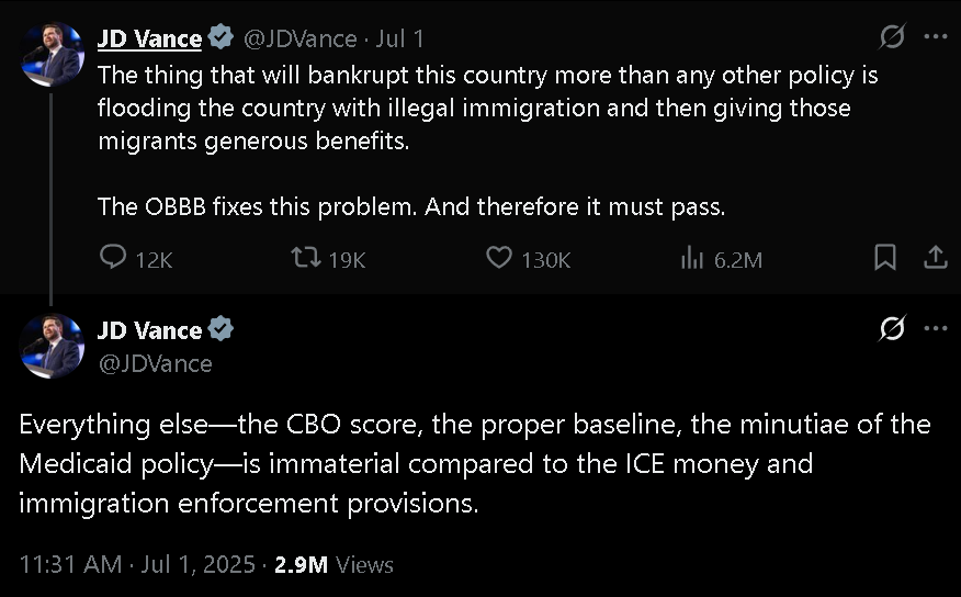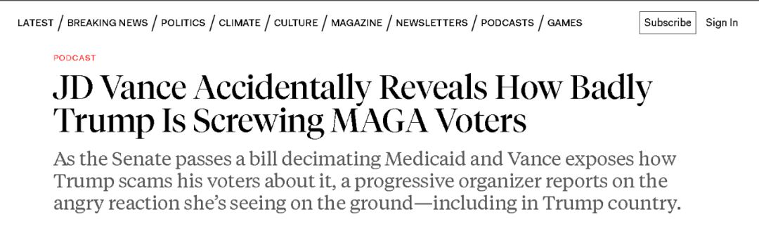 不僅如此,《新共和》雜誌的報道還提到,儘管美國副總統萬斯連日來一直通過轉移矛盾的話術給這個法案辯解,稱美國人面臨的真正威脅是非法移民問題,醫保等基本福利被砍在非法移民面前都是小事,還稱特朗普和共和黨通過的“大而美”法案給應對非法移民問題強有力的資金支持,但特朗普那些低收入的支持者,這次卻並不買賬了——畢竟,“大而美”法案觸動的是這些人的根本利益。