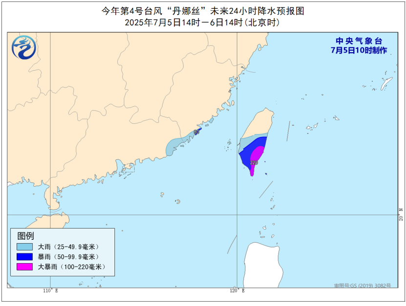 降水預報:7月5日14時至6日14時,台灣島東南部、福建南部和廣東東部部分沿海地區將有大到暴雨,台灣島局地有大暴雨(100-220毫米)。