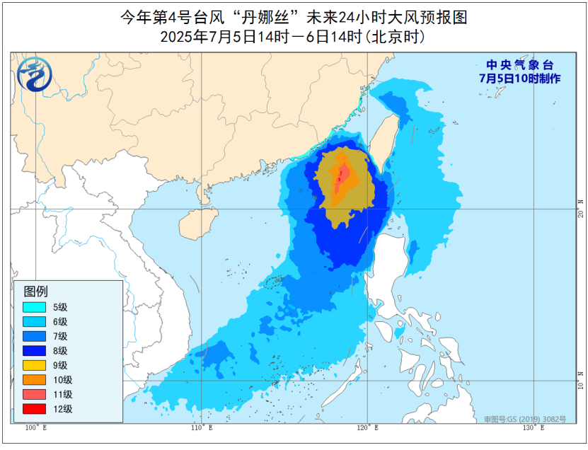*大風預報:*7月5日14時至6日14時,南海東部和南部、台灣海峽南部、巴士海峽西部、廣東東部沿海、福建南部沿海、台灣島沿海將有7-9級大風,“丹娜絲”中心經過的附近海域風力可達10-12級、陣風13級。