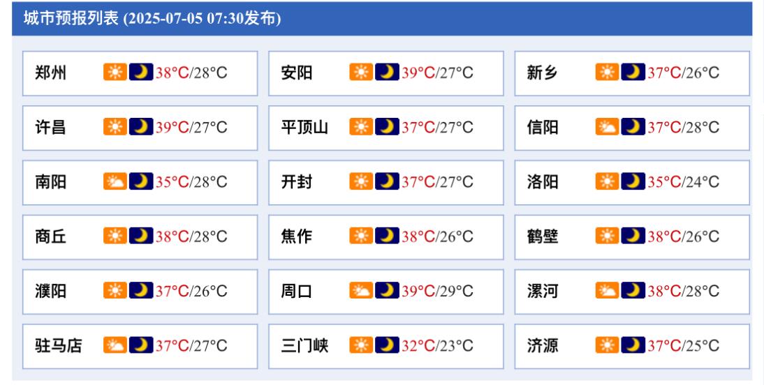 7月5日6時5分至7月5日10時35分,河南高温預警信號已達106條。其中,