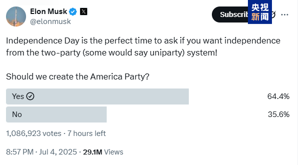在美國總統特朗普7月4日將“大而美”法案簽署成法的幾個小時前,特朗普的前盟友、企業家埃隆·馬斯克通過社交平台發起了一項關於成立美國新政黨的投票。