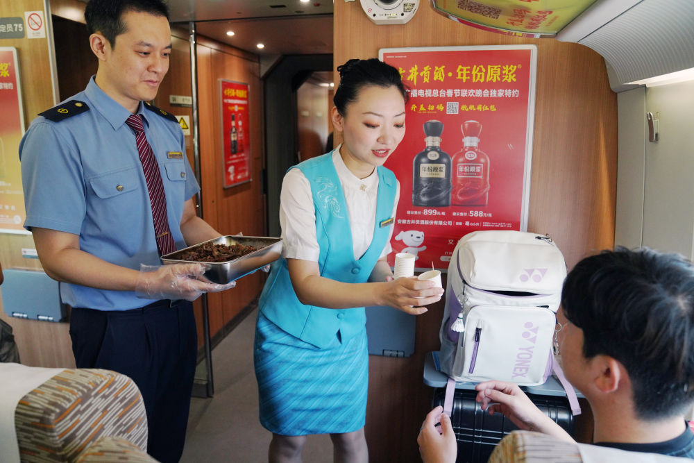 7月1日,長三角鐵路上的餐飲服務員為旅客介紹新品餐食。新華社記者 王翔 攝