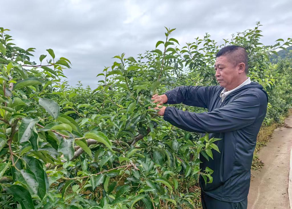 6月20日,北鍋盔村黨支部書記欒仁生正在果園裏疏枝。新華社記者王帆 攝