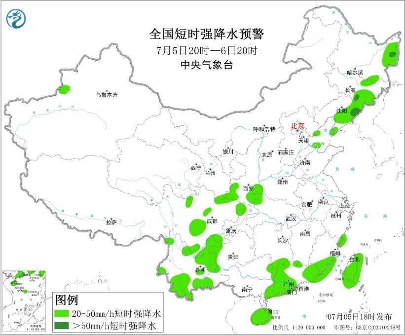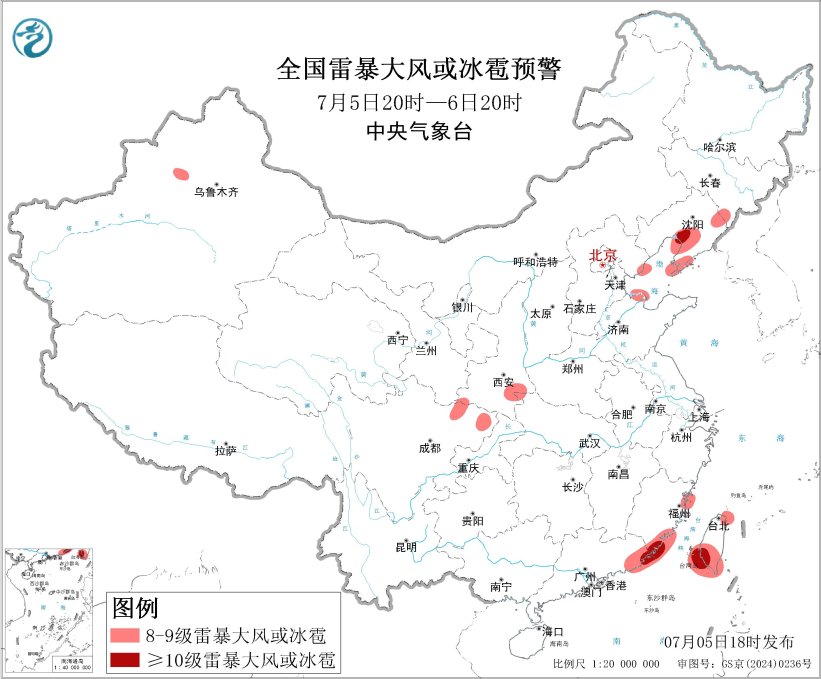預計7月5日20時至6日20時,東北地區南部、華南東部等地的部分地區將有8級以上雷暴大風或冰雹天氣,其中,遼寧南部、福建東南部、廣東東部、台灣島南部等地的部分地區將有10級以上雷暴大風,最大風力可達11級以上;東北地區東部、西北地區東南部、西南地區、華南東部等地的部分地區將有小時雨量大於20毫米的短時強降水天氣,其中,黑龍江東北部、吉林南部、遼寧東部等地的部分地區小時雨量大於50毫米,最大可達70毫米以上。