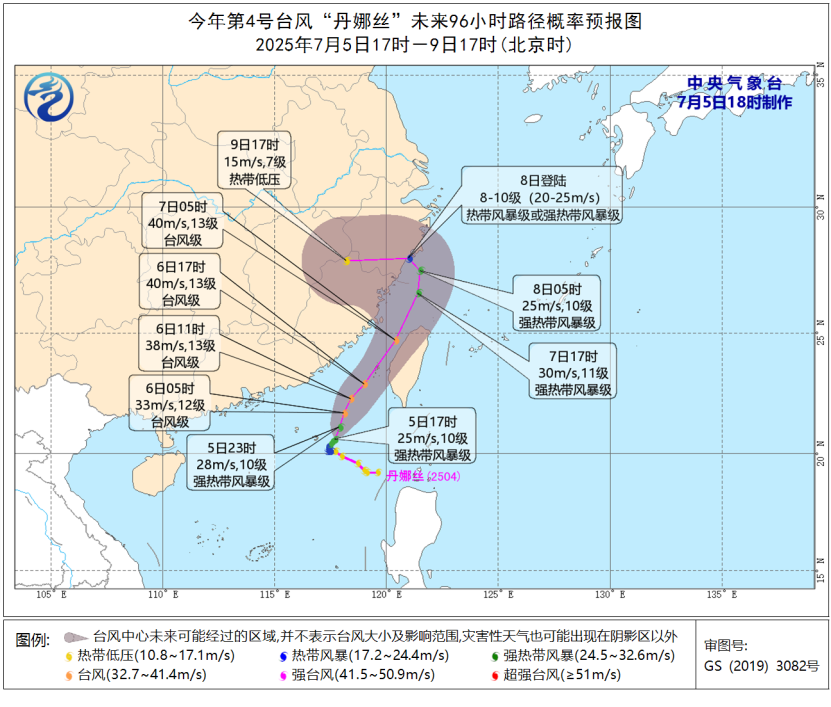 中央氣象台7月5日18時對台風“丹娜絲”的路徑和強度預報