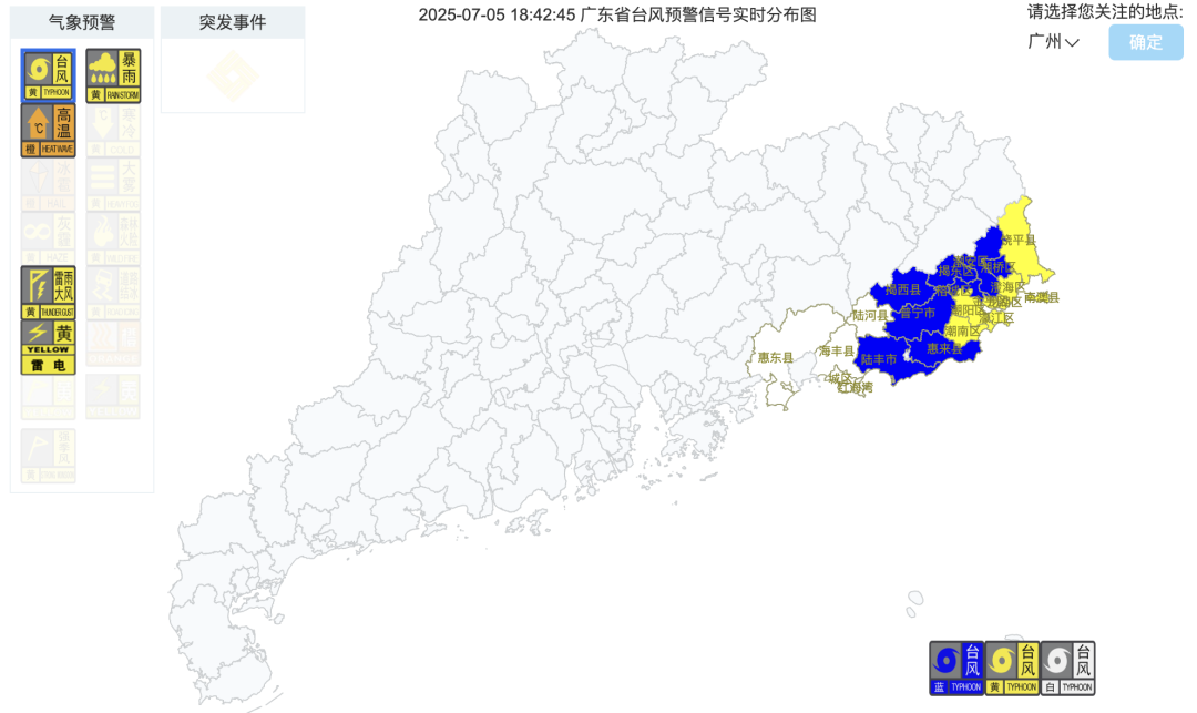 截至7月5日18時42分,廣東台風預警信號發佈情況 廣東氣象網截圖