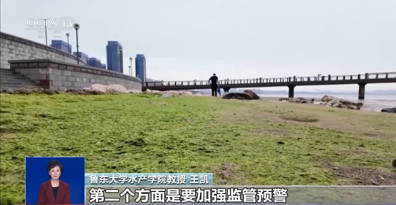 *魯東大學水產學院教授 王凱:*首先我們要控制污染源,減少對營養源的陸源和海源的輸入。第二個方面是要加強監管預警,同時要建立防控的體系,通過衞星遙感、無人機巡查和大數據分析,我們可以建立一個全方位的監控網絡,我們可以預測滸苔的生長趨勢和漂移方向。第三個在應急處理方面,當滸苔暴發初期應該啓動前置的打撈機制。