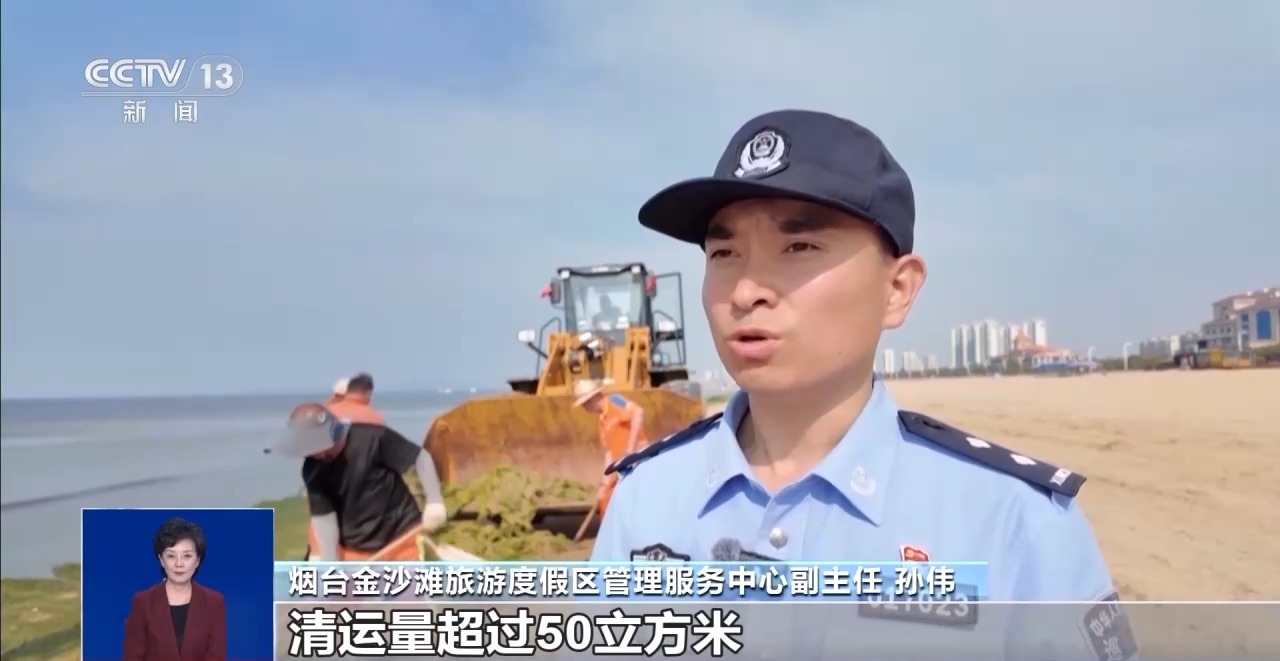 *煙台金沙灘旅遊度假區管理服務中心副主任 孫偉:*採取人工加機械工作模式,日清滸苔面積約達8萬平方米左右,清運量超過50立方米。