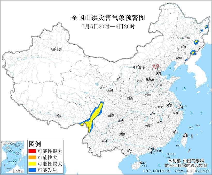 預計,7月5日20時至6日20時,遼寧東部、吉林東北部和東南部、黑龍江東部、四川西部、雲南西北部、西藏東南部、甘肅西南部、青海東南部等地部分地區可能發生山洪災害(藍色預警),其中,吉林東北部和東南部、黑龍江東部、四川西部、雲南西北部、西藏東南部等地部分地區發生山洪災害可能性較大(黃色預警)。其他地區也可能因局地短歷時強降水引發山洪災害,請各地注意做好即時監測、防汛預警和轉移避險等防範工作。