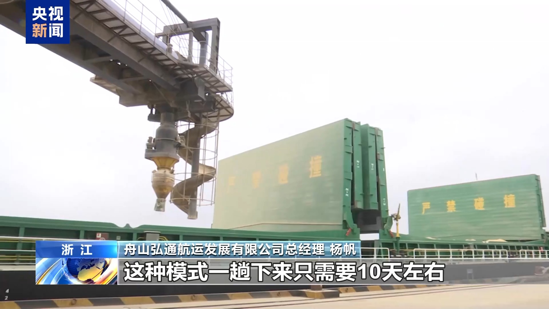 *舟山弘通航運發展有限公司總經理 楊帆:*以往大船難進江,小船難出海,我們運輸貨物需要換船,一趟約15天到20天。現在同一艘船舶完成由江入海運輸全程,這種模式一趟下來只需10天左右,差不多能降低成本20萬元。