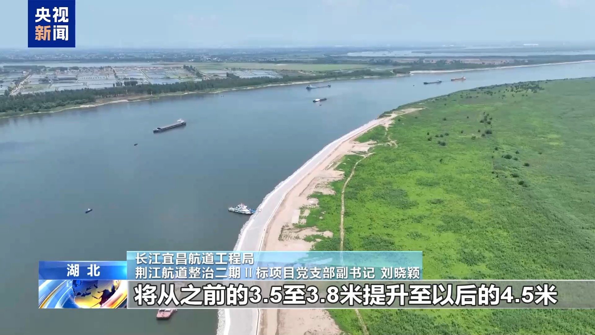 *長江宜昌航道工程局 荊江航道整治二期Ⅱ標項目黨支部副書記 劉曉穎:*工程建設完成後,荊江河段枯水期的航道維護水深將從之前的3.5到3.8米提升至以後的4.5米,船舶噸級也將從3000噸級提升至將來的5000噸級,通航潛力將得到極大釋放,進一步降低長江航運物流成本。