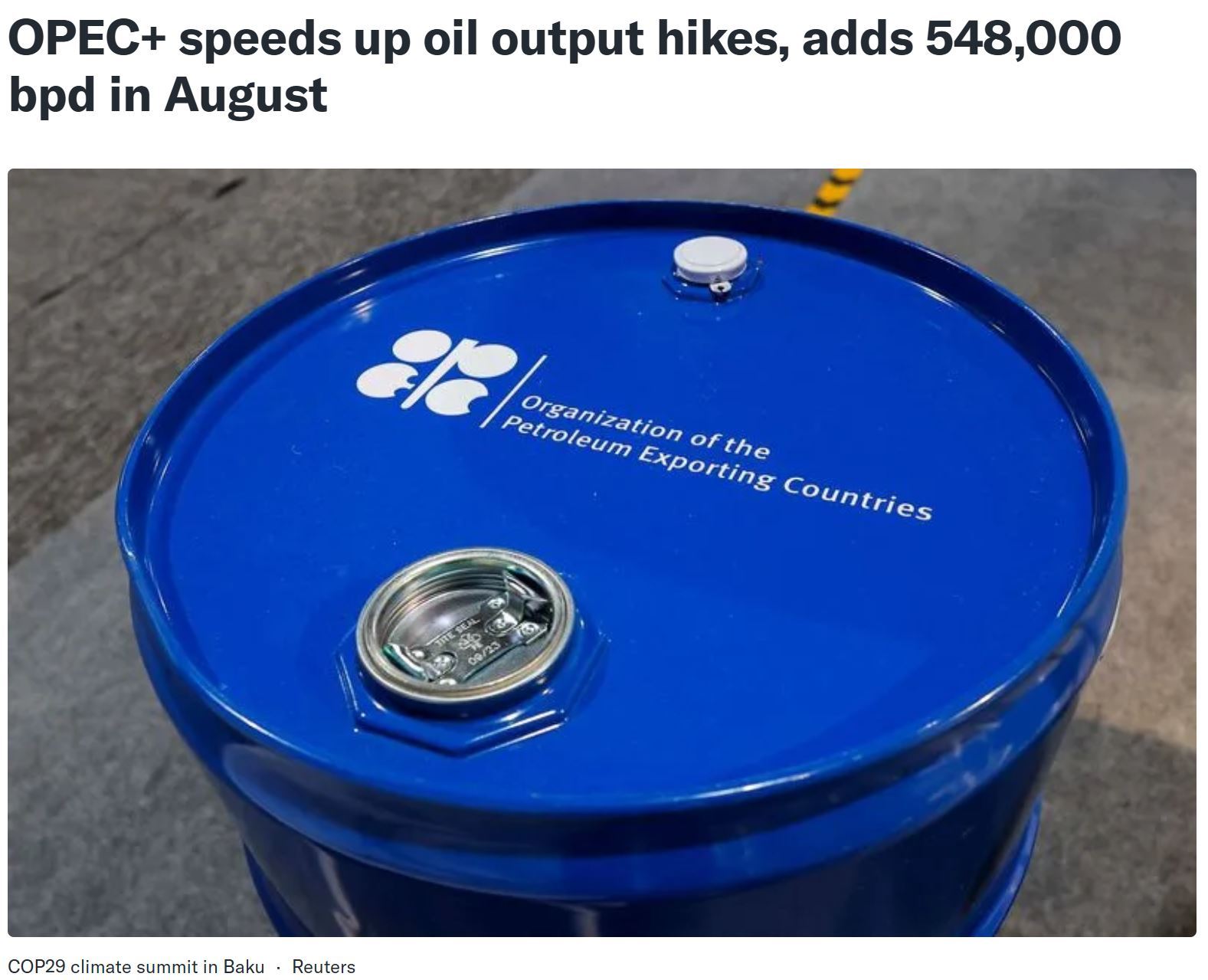 受以色列和伊朗衝突等地緣政治衝突的影響,國際油價一度超過每桶78美元。非“歐佩克+”國家都在增加石油產量,這會擠壓“歐佩克+”產油國的國際市場份額。