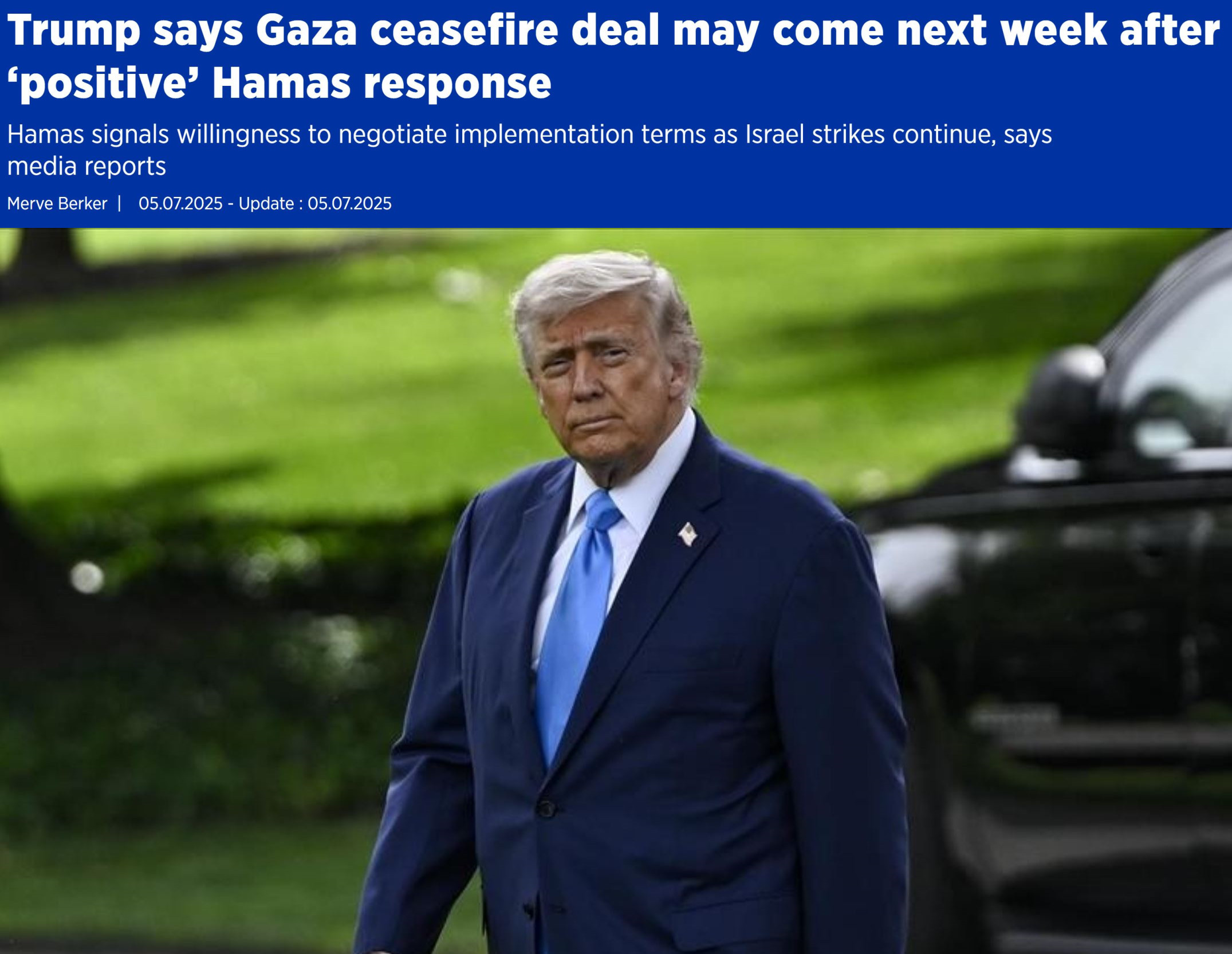 對於有關停火協議的達成,美國方面近期持積極態度。美國總統特朗普當地時間4日表示,加沙停火協議可能於下週達成。