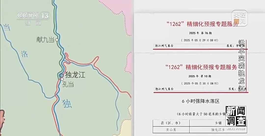 州氣象台在2025年5月29日8時、20時以及5月30日8時,三次發佈的預報預警,明確12小時內強降水落區在貢山獨龍族怒族自治縣。5月30日州氣象台又三次發佈6小時預警,明確強降水落區就在獨龍江鄉。